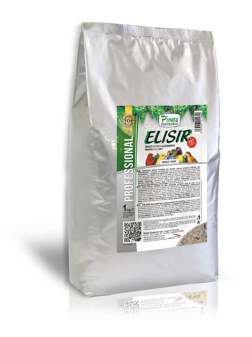 Elisir Bianco Morbido Allevamento (Pineta Zootecnici) is a premium high-protein bird food designed for the breeding of canaries and finches. This white soft bird food from the pinewood, is a dry, seedless formula enriched with egg white, providing high biological value and essential nutrients for all stages of breeding.