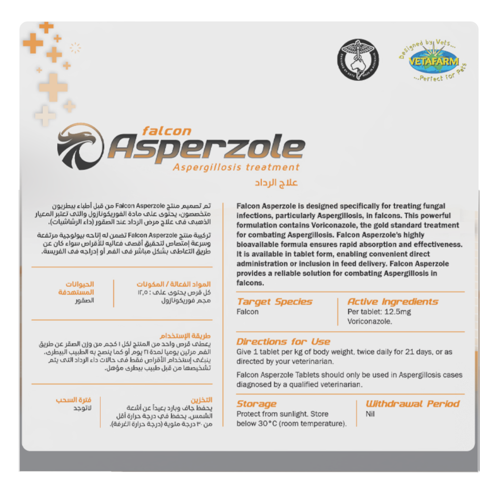 Falcon Asperzole Tablets is for the treatment of Aspergillosis in hunting falcons and pet birds. Its active ingredient, Voriconazole, is a relatively new triazole antifungal active ingredient but has quickly become the standard for the treatment of fungal infections in humans, and has proven superior to amphotericin B for the treatment of aspergillosis.